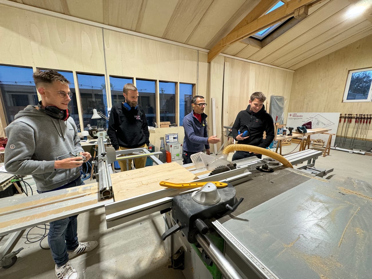The workshop is equipped with professional machines (table saw, planer, jointer, band saw, pendulum saw), and power-tools. Several workbenches complete the space and allow you to learn comfortably in groups.